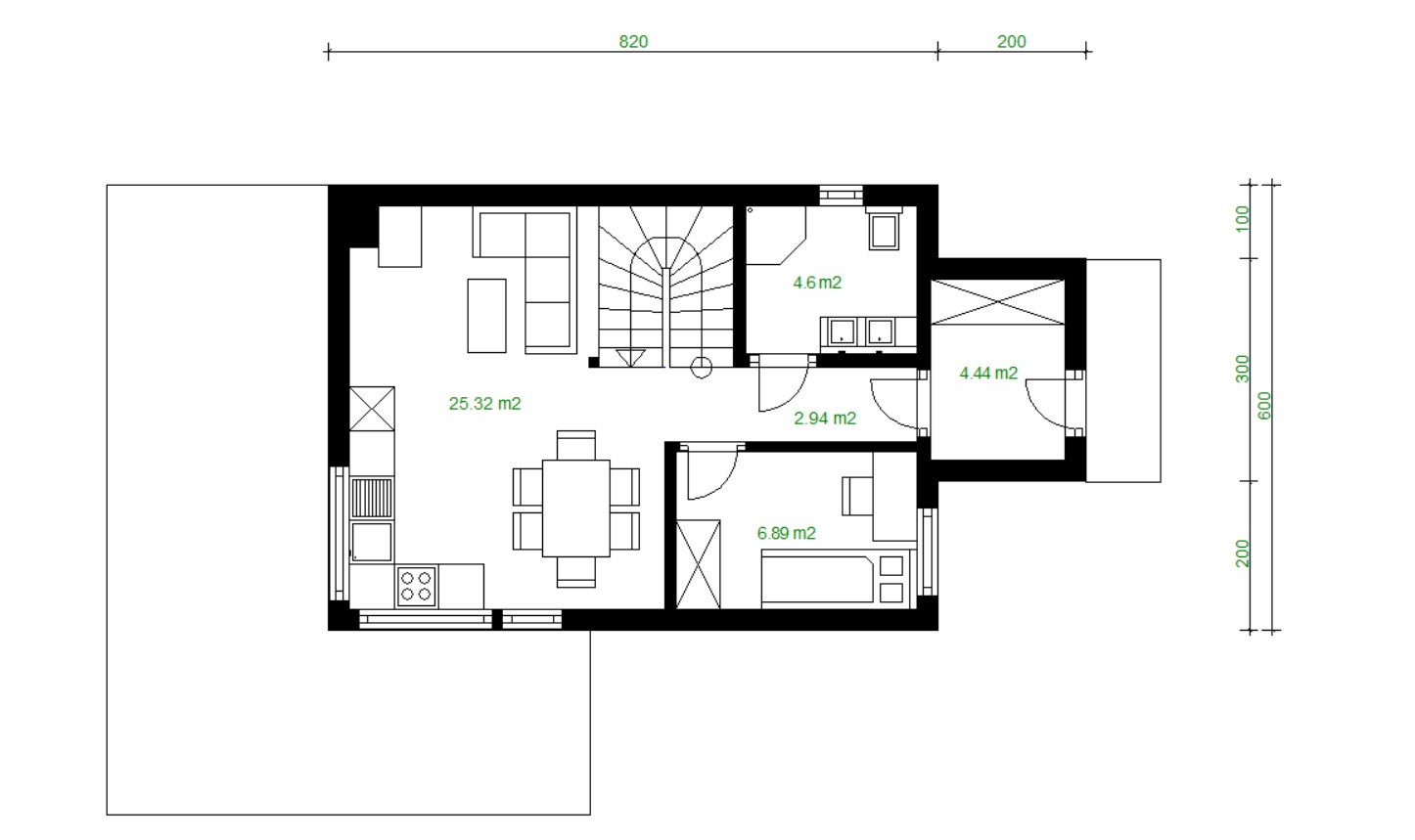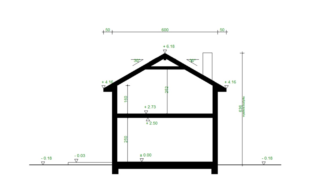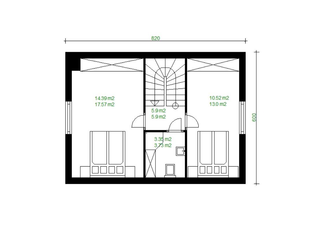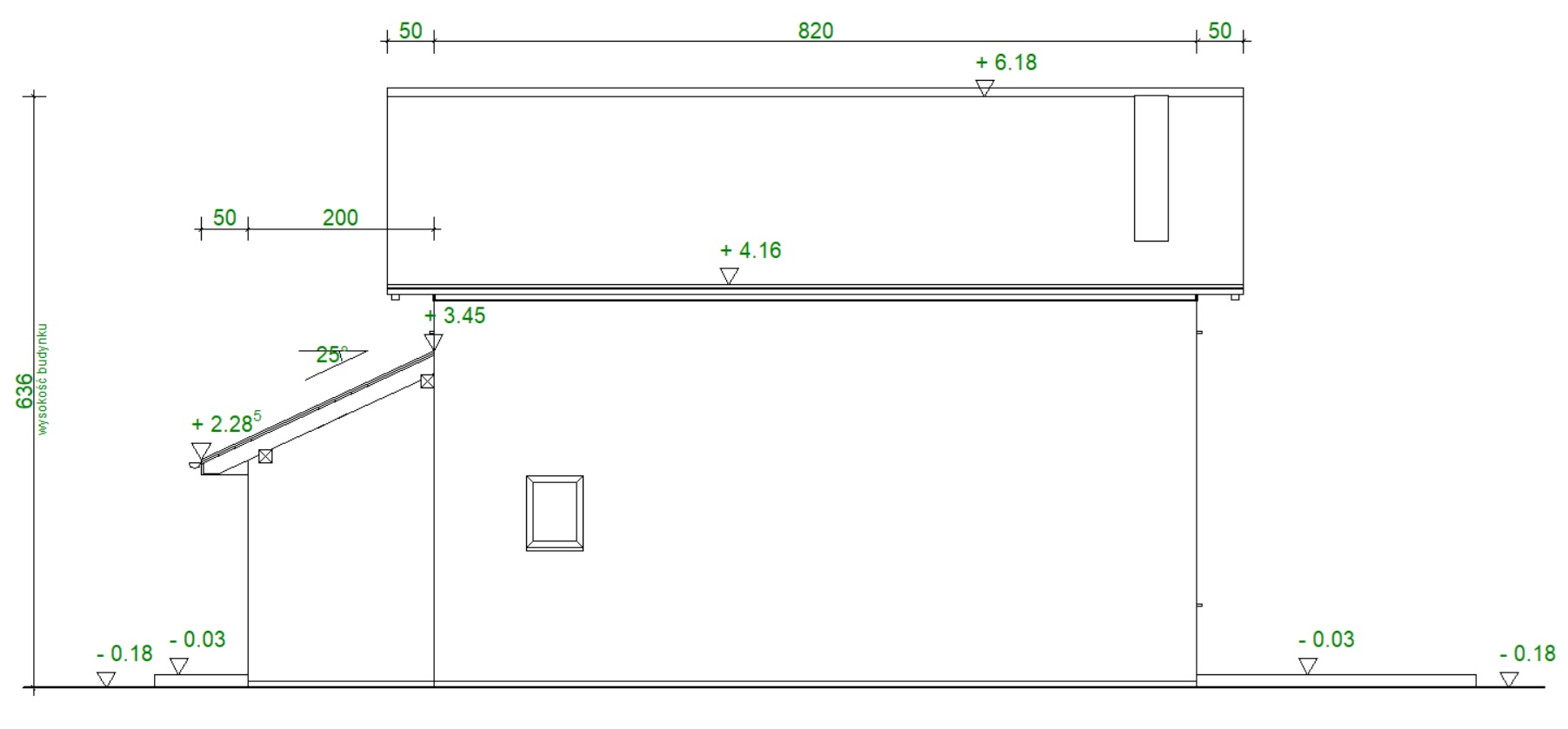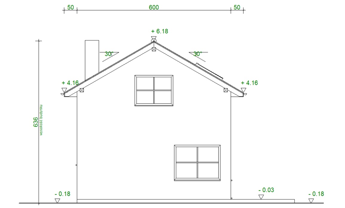 Wymiary zewnętrzne budynku to 6.00×10.20m. Wysokość budynku to 6.36 m. Dach dwuspadowy 30 stopni oraz 25 stopni.